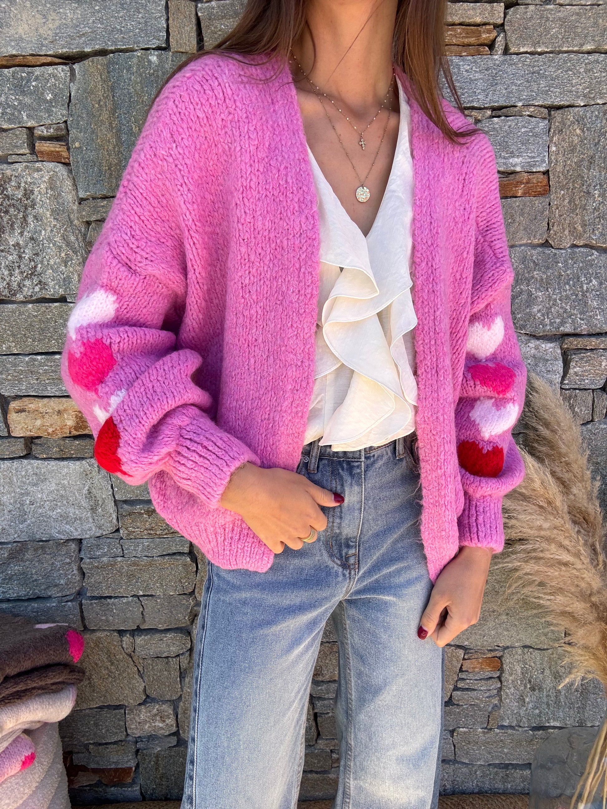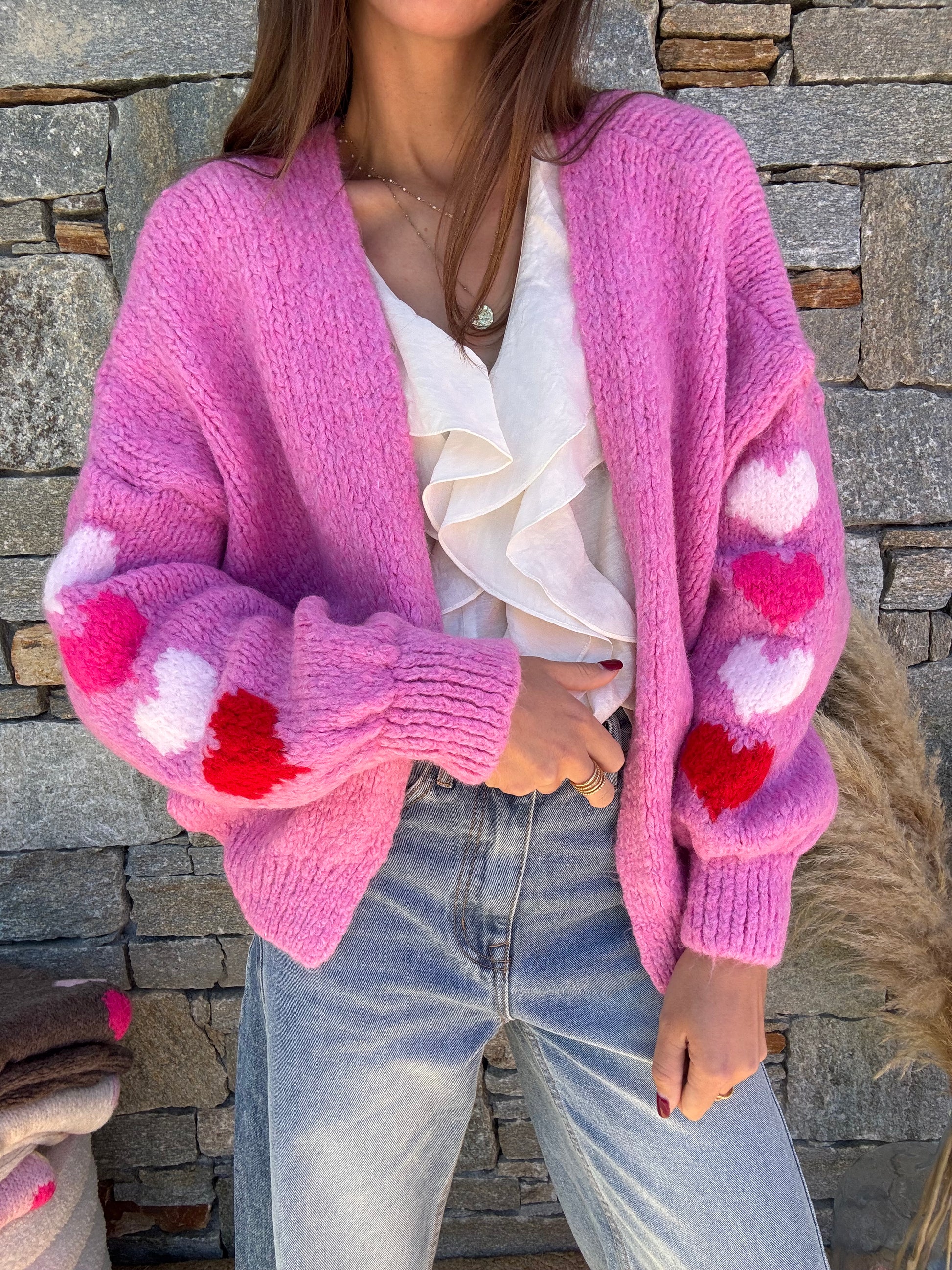 Les petits gilets en grosse maille avec des petits cœurs sur la manches