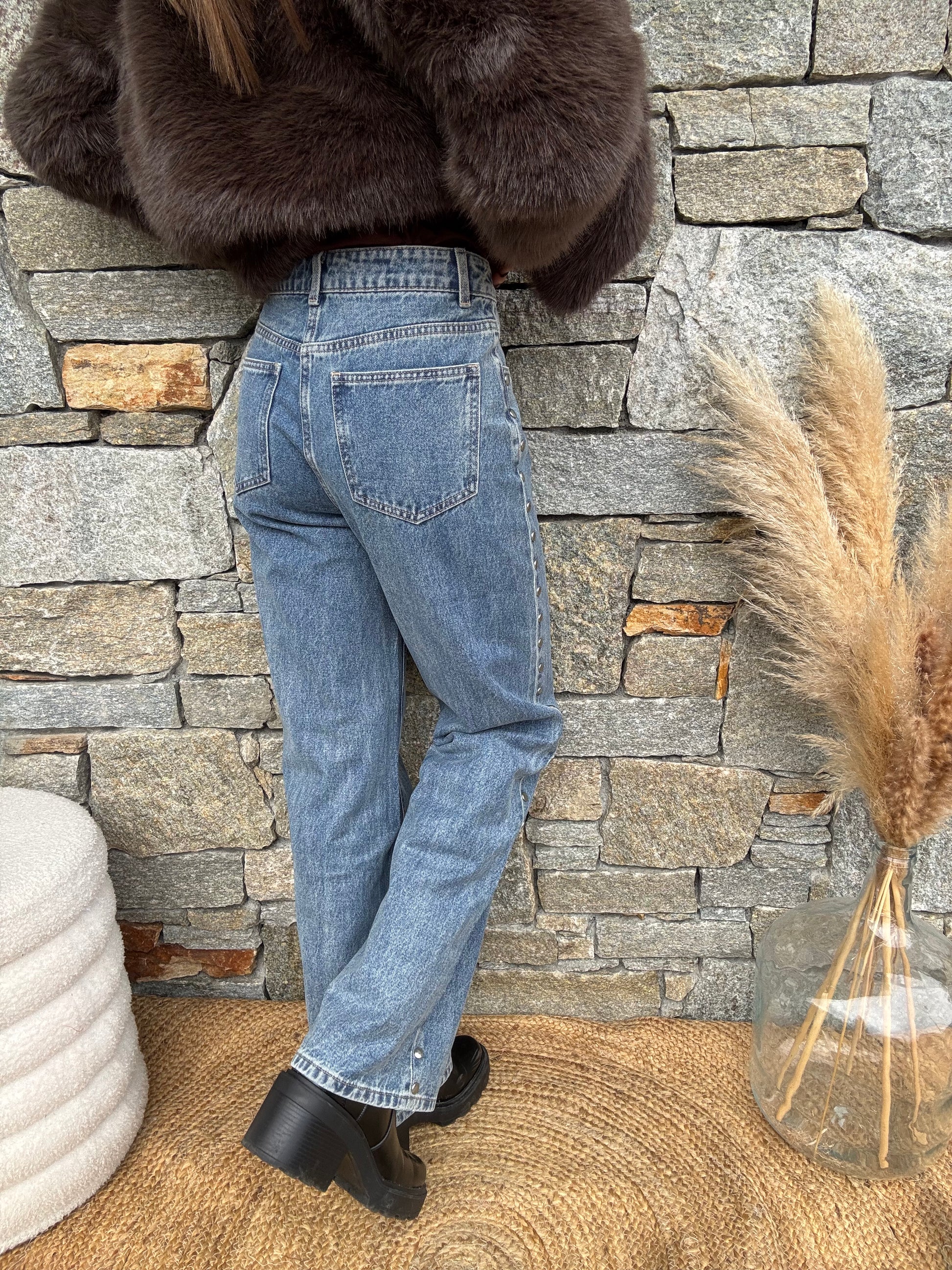 Le jean s’agrémente de poches sur le devant et sur l’arrière. Il dispose également de passants si vous souhaitez ajouter une ceinture, mais aussi de petits clous sur tout le côté de la jambe.