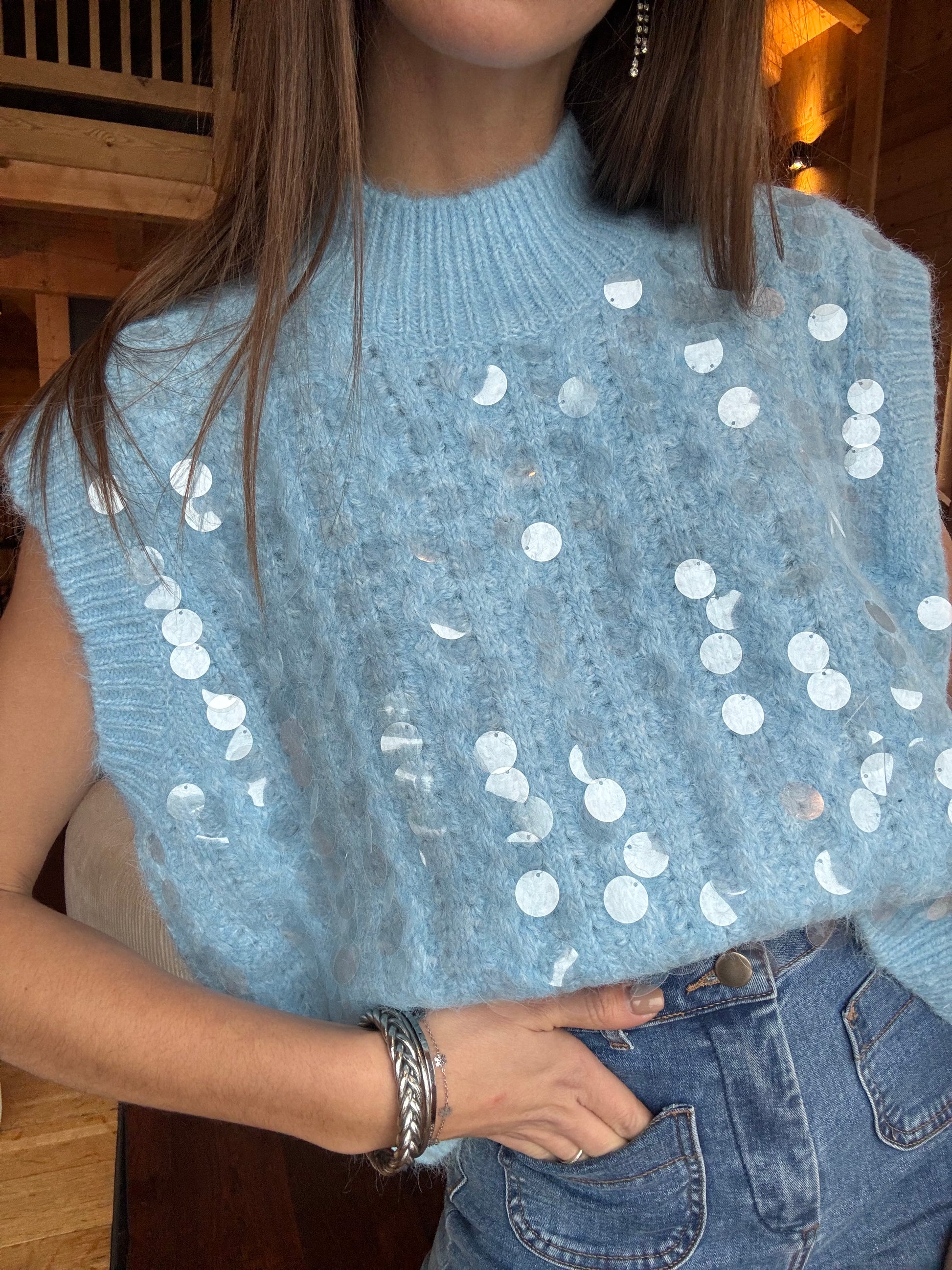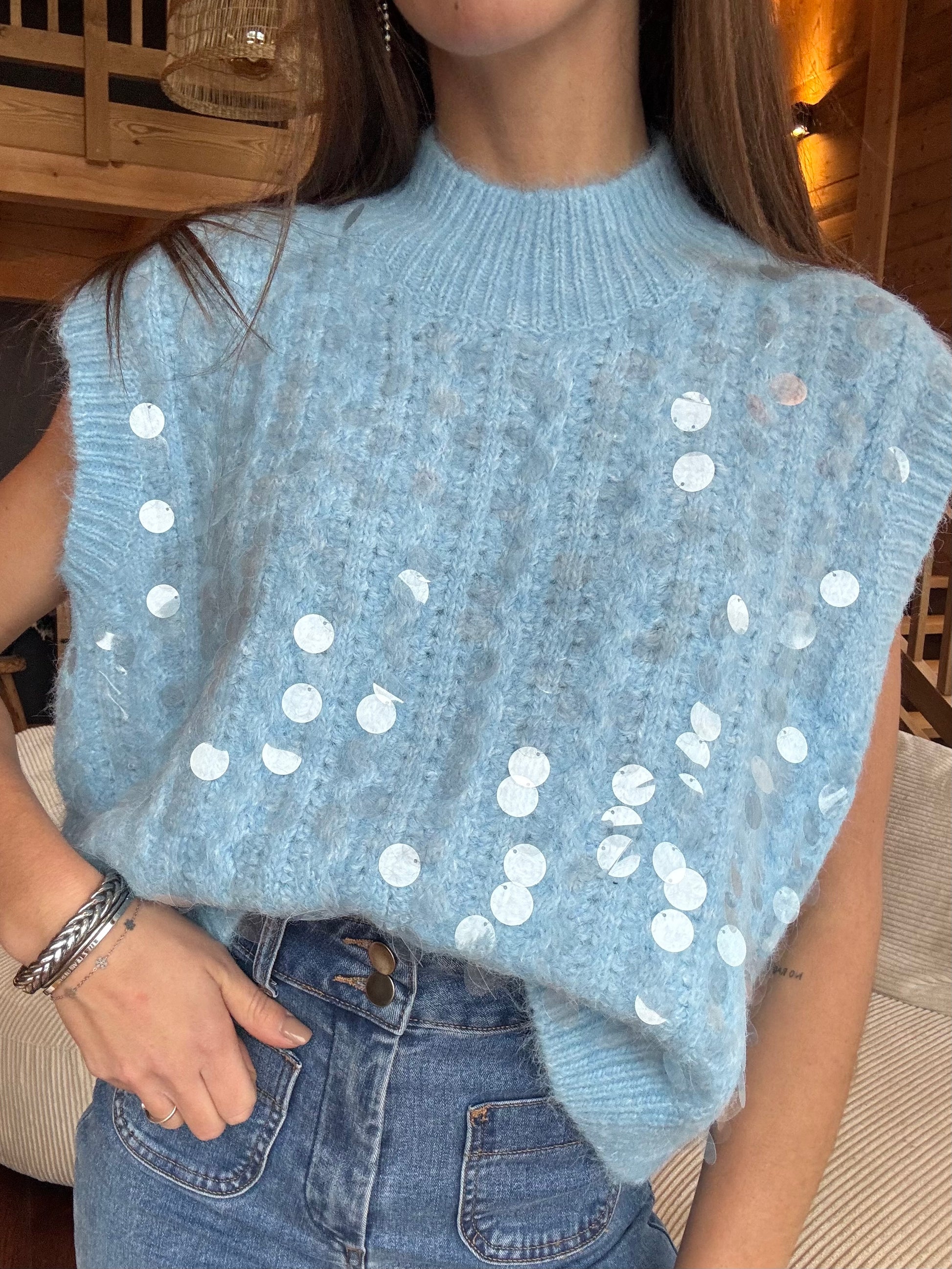Un coup de coeur de plus aux bichettes pour ce petit pull sans manches col cheminé à sequin ! Si chic pour les fêtes de fin d’année