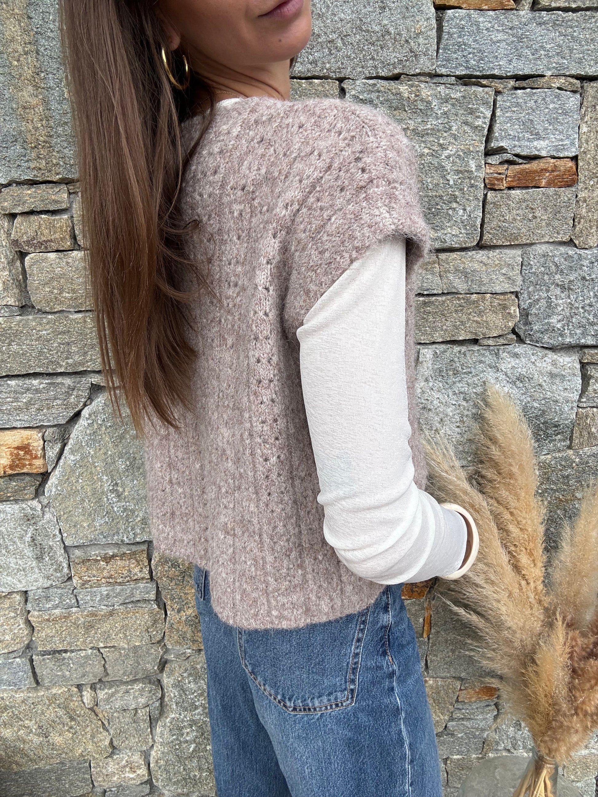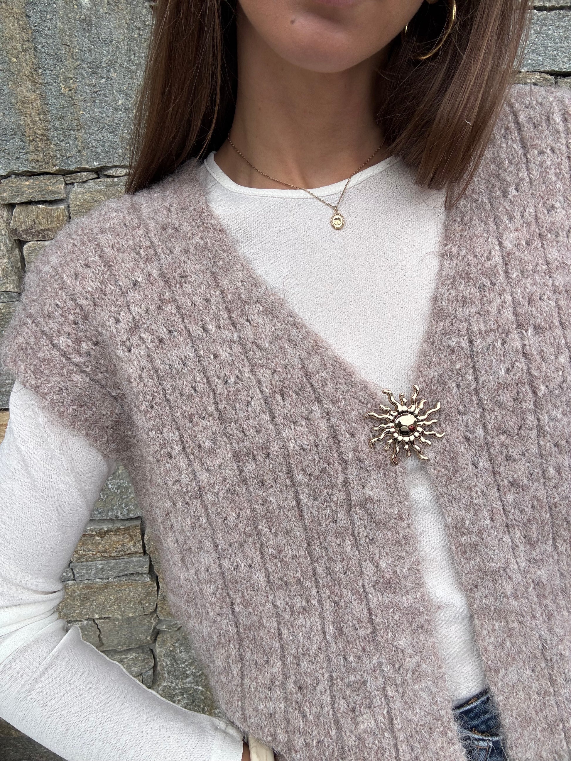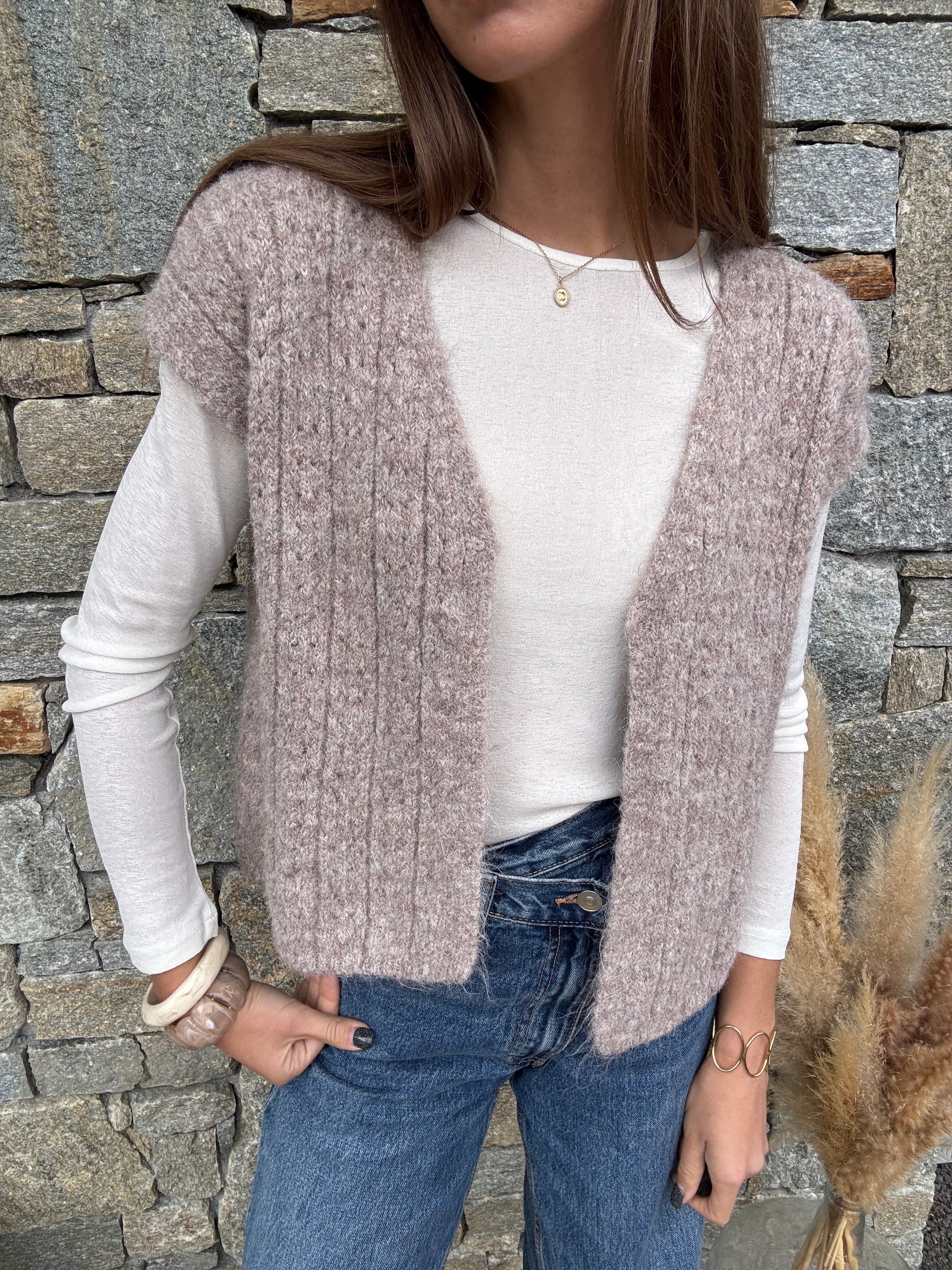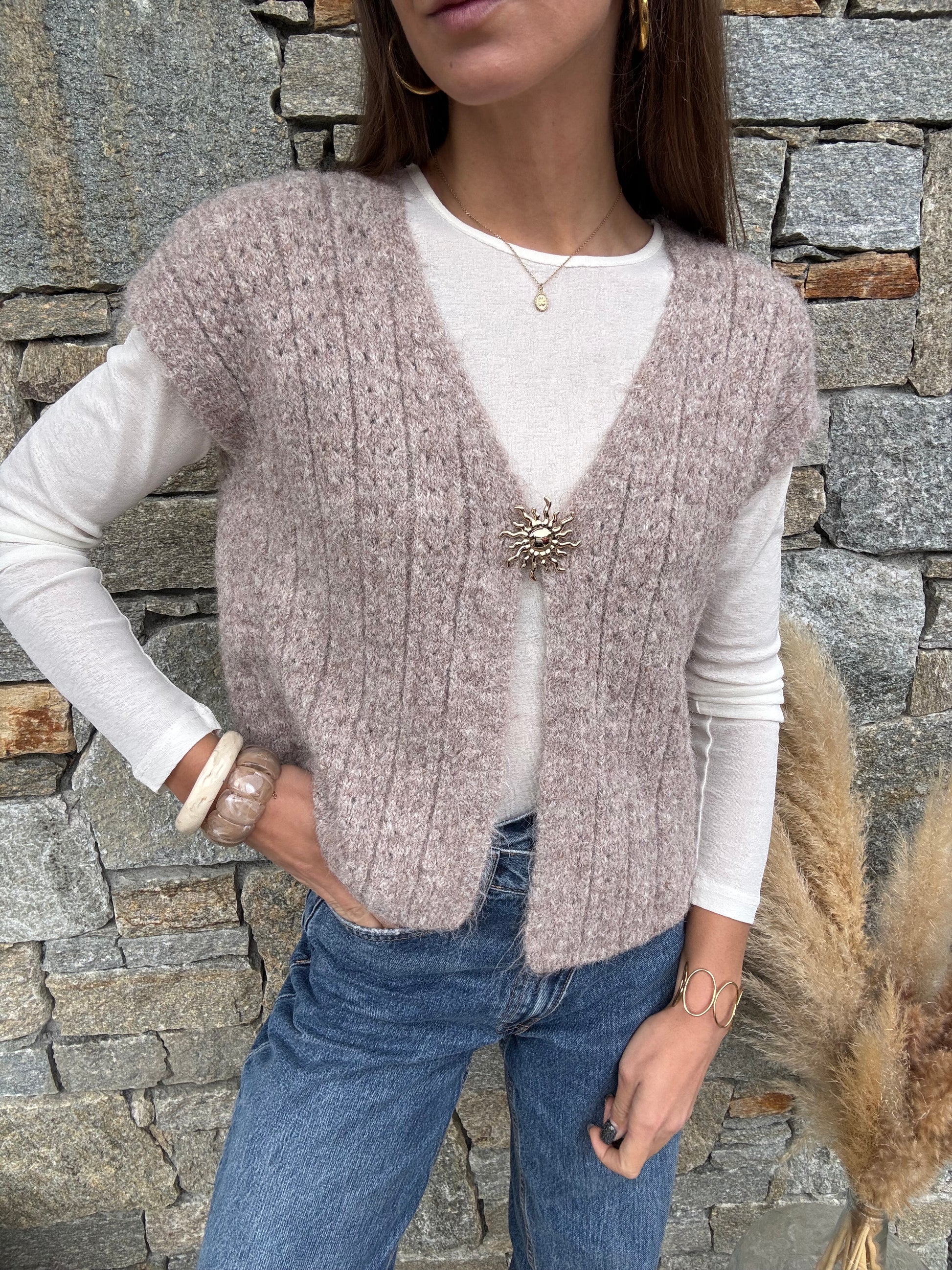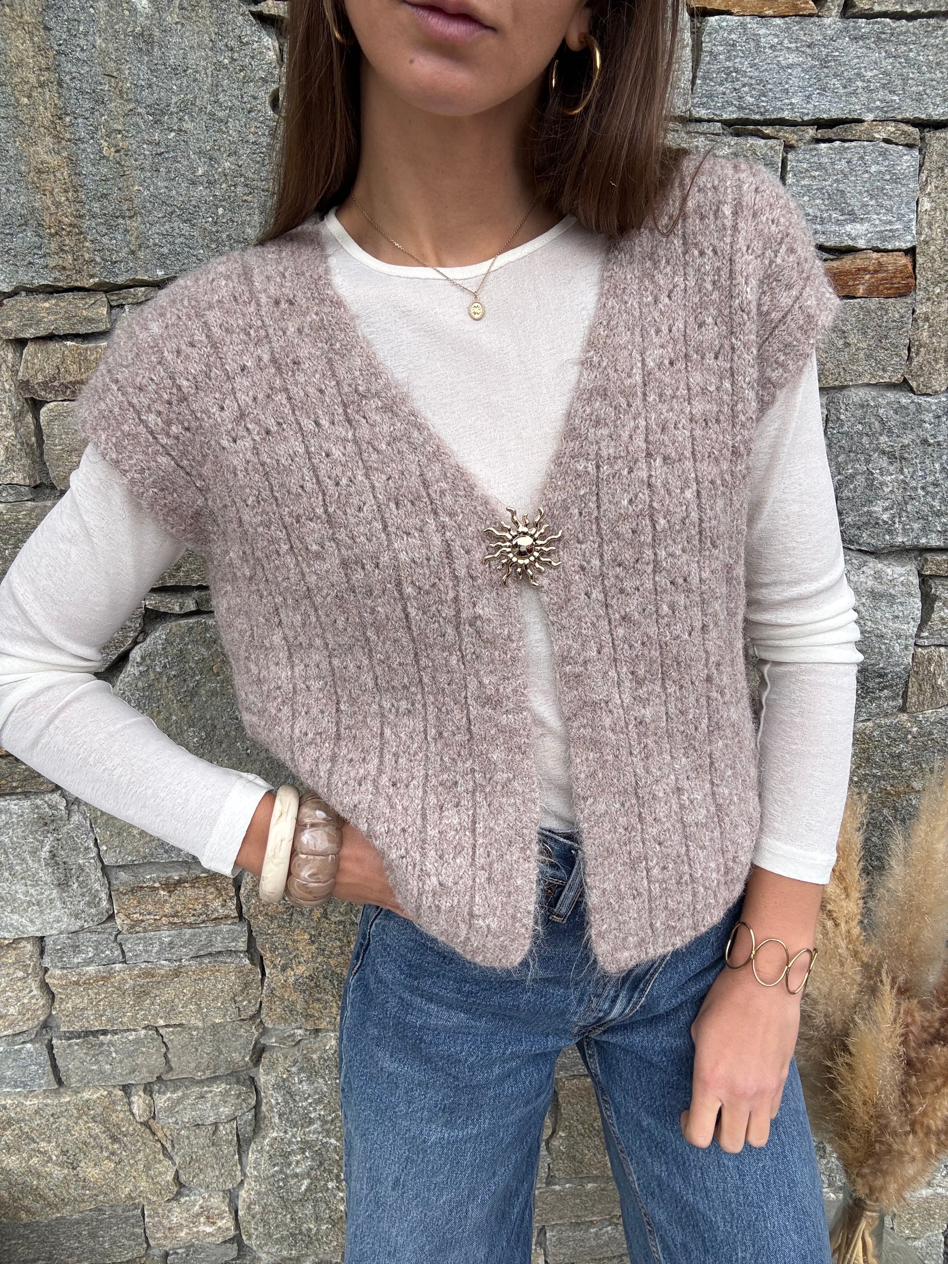 Ce petit gilet sans manches avec broche, une maille travaillée