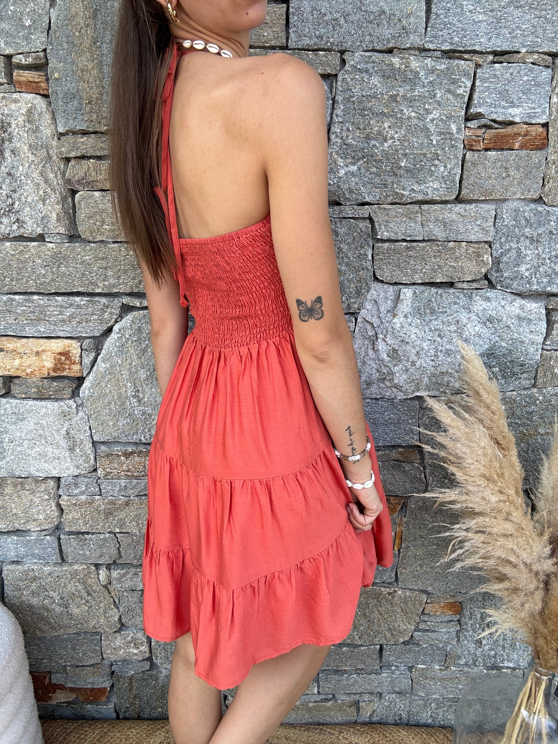 Coupe fluide, bretelles fines à nouer autour du cou. Détail smocké au dos. Matière légère à effet texturé.