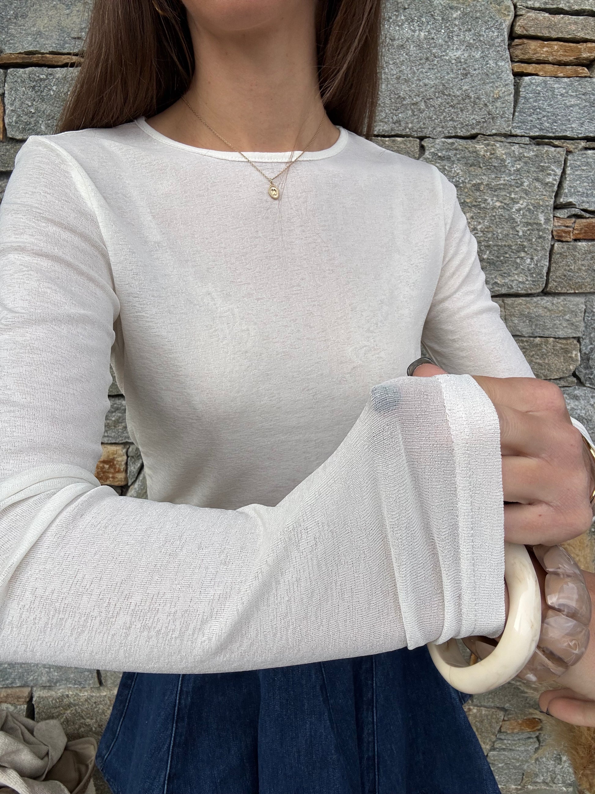 À porter sous forme de top légèrement transparent avec un pull sans manche, un blaser échancré mais en sous pull pour un apport de chaleur supplémentaire en période hivernale.